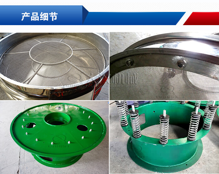 粉末旋振篩主要由進料口、防塵蓋、出料口、束環、篩網、配重塊、上部重錘、振動體、振動電機、彈簧、下部重錘、機座等部分組成。