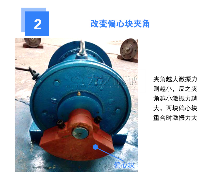 振動(dòng)電機(jī)通過改變偏心塊夾角的大小來調(diào)節(jié)偏心塊,夾角越大激振力則越小,反之夾角越小激振力越大,兩塊偏心塊重合時(shí)激振力大。