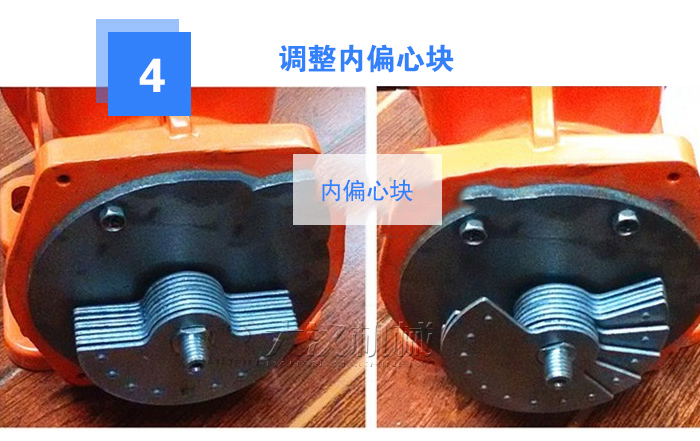 旋松兩側(cè)內(nèi)偏心塊壓緊螺栓,兩側(cè)內(nèi)偏心塊同向轉(zhuǎn)動(dòng),使內(nèi)偏心塊上的激振力標(biāo)尺刻線對準(zhǔn)外偏心塊上的開縫,調(diào)整所需激振力,擰緊內(nèi)偏心塊壓緊螺栓,裝上防護(hù)罩。