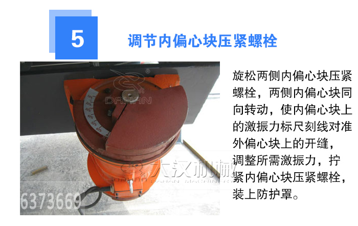 轉(zhuǎn)軸的兩端面上都刻有基準(zhǔn)線,旋松兩側(cè)外偏心塊壓緊螺栓,兩側(cè)外偏心塊同向轉(zhuǎn)動(dòng),使軸上刻線對準(zhǔn)外偏心塊上的激振力標(biāo)尺刻線,調(diào)整所需激振力,擰緊外偏心塊壓緊螺栓,裝上振動(dòng)電機(jī)的防護(hù)罩就可以了。