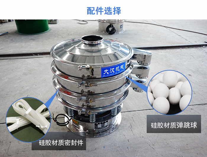 為了配合不銹鋼旋振篩篩分的潔凈性,要求不銹鋼旋振篩的相關配件也需要達到一定的標準,其清網裝置-彈跳球和密封裝置-密封件要采用食品硅膠材質,以防止對物料造成一定的污染性。